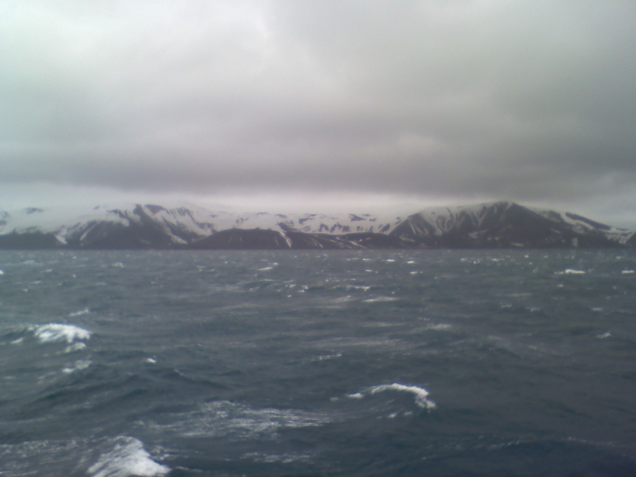 We arrived near Half-Moon Bay just before dinner but Sebastian said it was too windy and conditions were not right for a landing. But we will wait here, where it is a bit calmer, until after dinner. We were to have tiramisu for desert but the rocking of the ship caused it all to be tossed on the floor so they substituted pineapple rings with whip cream. Following dinner we were treated with a showing of Meet the Fockers in the conference room. There was a talk earlier in the day about seals which I did not attend because I was napping. After the film we walked back upstairs to see the last of Antarctica and the Shetland Islands pass by into the fog. A light snow covered the deck outside.